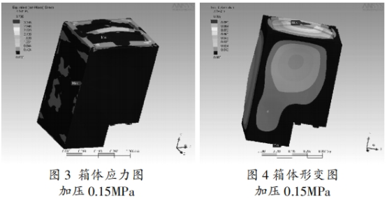 箱壁厚度滿意資料的許應應力要求及氣箱答應變形量要求。經過軟件剖析核算后得到氣箱的應力散布(見圖3)及箱體形變(見圖4),畢竟找到氣箱壁厚。