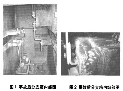2007年7月18日某地輸配電線路發生跳閘,在巡線至石板坡電纜分支箱時,發現電纜分支箱兩端的開關柜俑壁發生嚴重變形、601進線開關柜面板有飛弧、放電及炭黑等現象。外觀上,箱體內水跡明顯。儀表柜門已銹死,不得不撬開,操作機構已無法轉動、只能將其解體后打開關柜門。打開#601開關柜電纜室發現:計量TⅣV的熔斷器及支持絕緣子兩相全部炸碎、另一相熔斷器發生破裂,支持絕緣子發生破損,AT表面有爬電痕跡,柜體多處存在放電痕跡,如圖1所示。打開相鄰間隔查看,情況一樣嚴重,導電部分受潮嚴重,銅排及固定鏢栓已長鹵銹,TA表面有多處爬電痕跡,見圖2。該分支箱為某電器廠制造,2003年投運、僅3年多。
