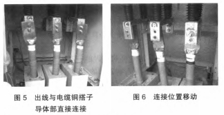 穿墻套管下部為出線,與電纜銅搭子導體部直接聯接,如圖5所示。撤消聯接螺栓后發生聯接方位移動,如圖6所示。此現象說明電纜銅搭子與穿墻套管存在很大的聯接變形,并發生應力,在電纜通電后發生的電動力和聯接應力進一步作用于穿墻套管,使得穿墻套管發生碎裂。